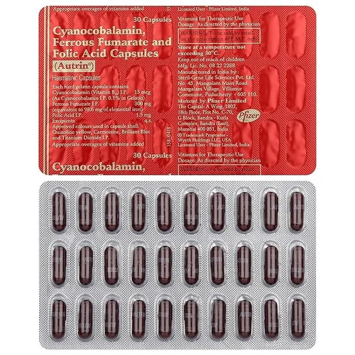 Autrin Hematinic Capsule with Cyanocobalamin, Iron & Folic Acid is a combination medicine used in the treatment of iron deficiency. It replenishes the iron stores in your body. Iron is vital for the formation of new red blood cells and hemoglobin, a substance that gives these cells the ability to transport oxygen.
