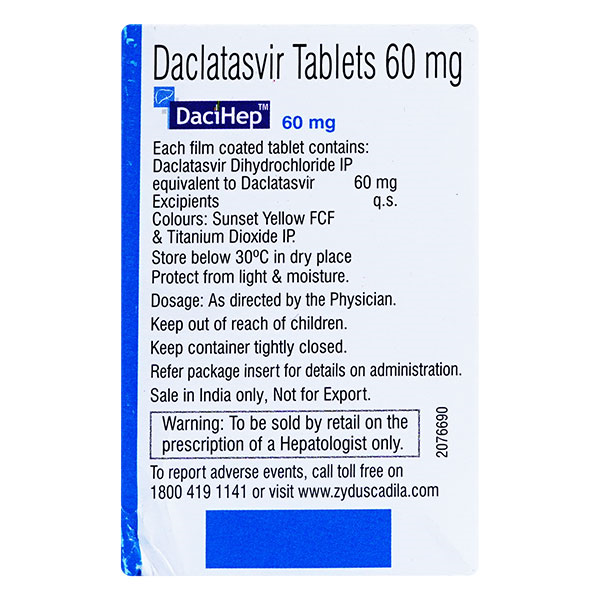 Dacihep 60mg Tablet should be taken in the dose and duration as advised by your doctor. It should be taken with or without food, preferably at a fixed time. Do not skip any doses and finish the full course of treatment even if you feel better If you miss a dose, take it as soon as possible. However, if it is almost time for your next dose, skip the missed dose and go back to your regular schedule. Do not double the dose.