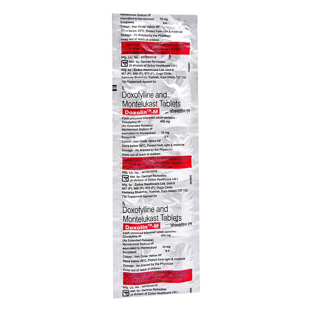Doxolin M Tablet is a combination medicine used to treat and prevent asthma. It helps in relaxing the muscles of the air passages, thus widening it and making it easier to breathe. It also relieves allergy symptoms like runny nose, sneezing, throat irritation, watery eyes, and congestion or stuffiness.