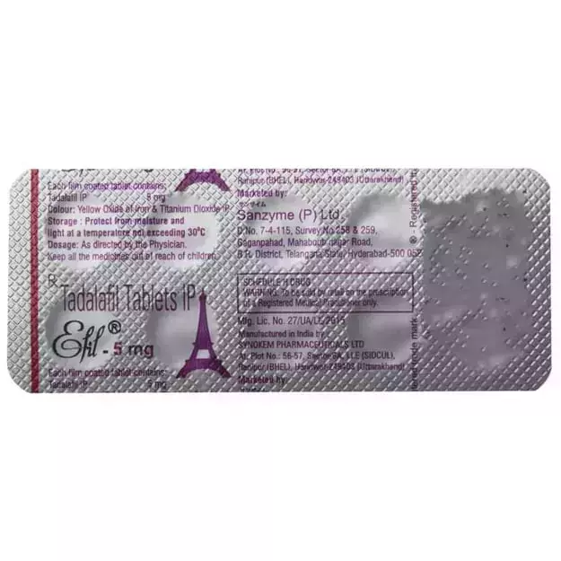 Efil 5mg Tablet is a medication primarily used to treat erectile dysfunction (ED) in men. It helps in improving blood flow to the penile region, thereby facilitating and sustaining an erection. It is also effective in treating symptoms of benign prostatic hyperplasia (BPH).
