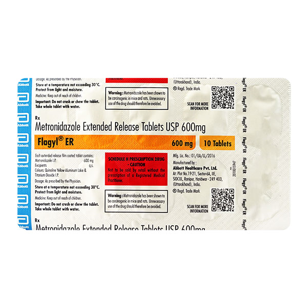 Flagyl ER Tablet is an antibiotic medicine that helps your body fight infections caused by bacteria and parasites. It is used to treat infections of the liver, stomach, intestines, vagina, brain, heart, lungs, bones, and skin.
