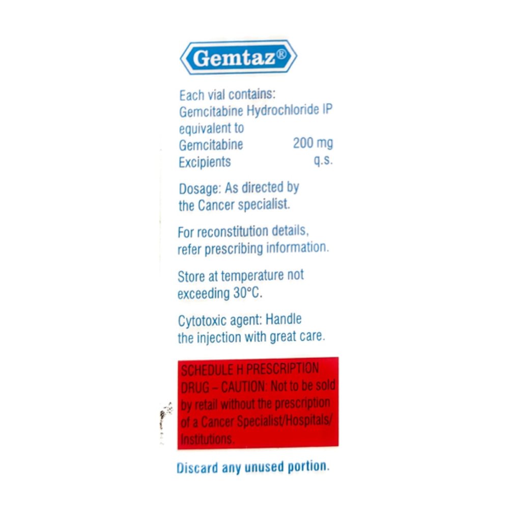 Gemtaz Injection helps to treat breast cancer and it may be used alone or in combination with other medicines or treatment modalities like chemotherapy. It relieves the symptoms of breast cancer such as breast lumps, bloody discharge from nipples or changes in the shape or texture of the breast. Gemtaz Injection kills or stops the growth of cancer cells and also prevents the multiplication of cancer cells. Discuss with your doctor if any of the side effects bother you.