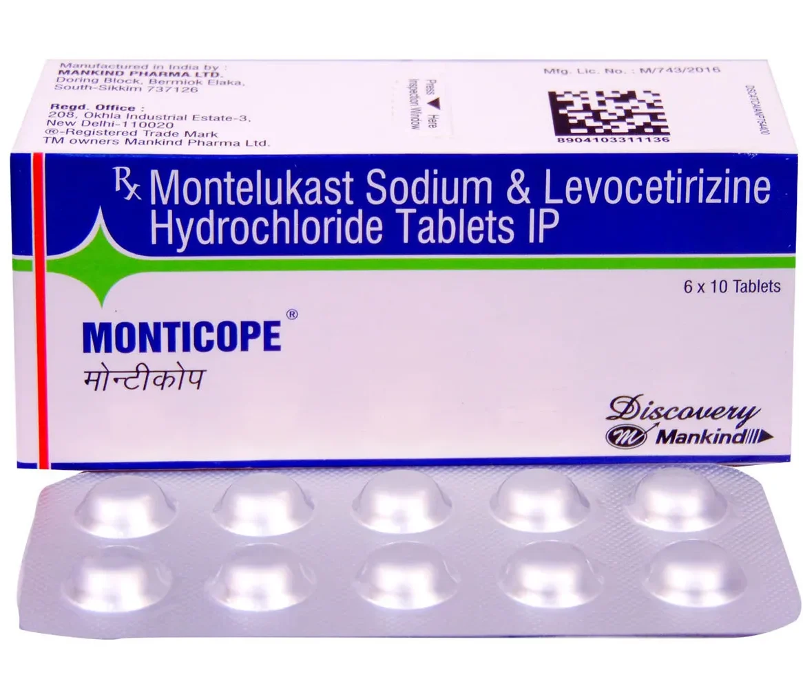 Monticope Tablet is a combination medicine used in the treatment of allergic symptoms such as runny nose, stuffy nose, sneezing, itching, swelling, watery eyes and congestion or stuffiness. It also reduces inflammation in the airways and make breathing easier.