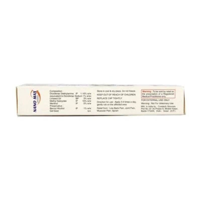 Nanomax Gel is a combination of four medicines: Diclofenac diethylamine, Linseed Oil, Methyl Salicylate and Menthol. Diclofenac diethylamine and Menthol are non-steroidal anti-inflammatory drugs (NSAIDs) which work by blocking the release of certain chemical messengers that cause pain and inflammation (redness and swelling). Linseed Oil is a plant-based oil which further reduces inflammation and improves blood circulation at the site of application. It also increases the penetration of Diclofenac diethylamine through the skin. Methyl Salicylate produces a cooling effect on the skin.