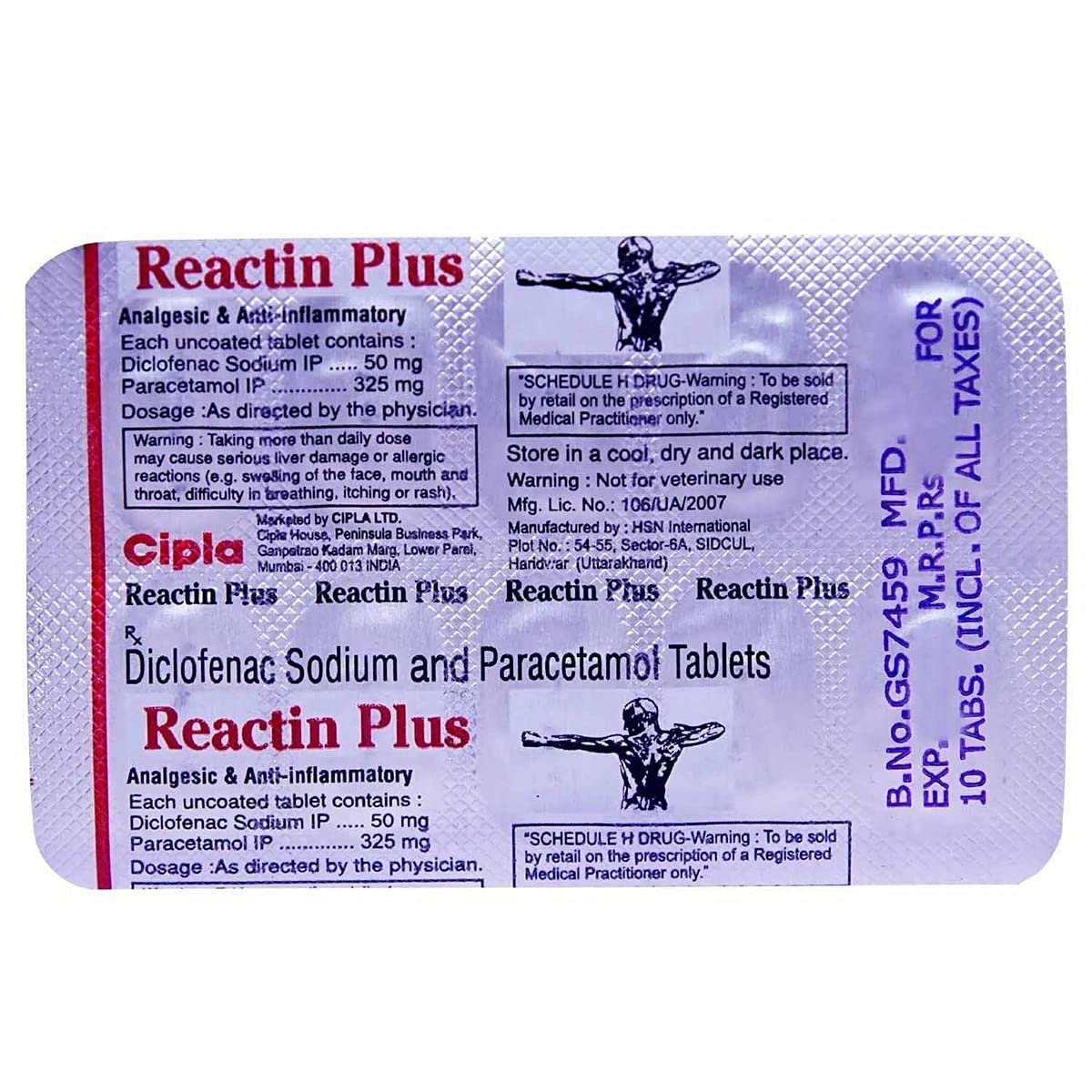 Reactin Plus Tablet is a pain-relieving medicine. It is used to reduce pain and inflammation in conditions like rheumatoid arthritis, ankylosing spondylitis, and osteoarthritis. It may also be used to relieve muscle pain, back pain, toothache, or pain in the ear and throat.
