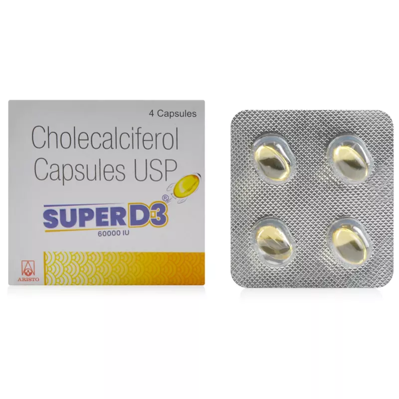 Super D3 60000IU Capsule is a capsule that can help deal with vitamin D3 deficiency. It may reduce fatigue and weakness associated with vitamin D3 deficiency. Moreover, it can help in the absorption of calcium into the body. It contains vitamin D3 (cholecalciferol (60000IU)) which helps in the processing of essential minerals in the body like calcium and phosphorus. Vitamin D3 helps to enhance calcium absorption for better bone health.