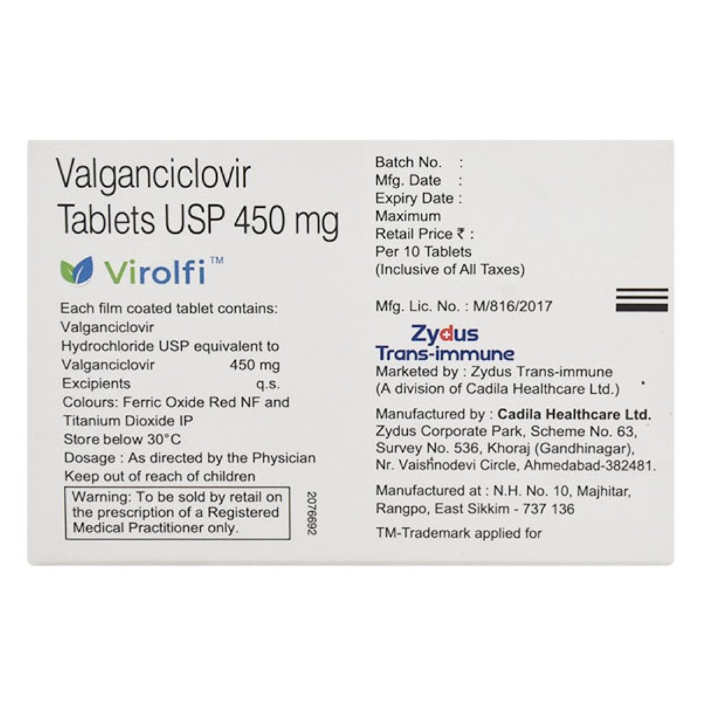 Virolfi 450mg Tablet is used to treat cytomegalovirus (CMV) infection of the retina (retinitis) in adult patients with acquired immunodeficiency syndrome (AIDS). It is also used for the prevention of CMV infection in patients who have received an organ transplant from a CMV-infected donor.